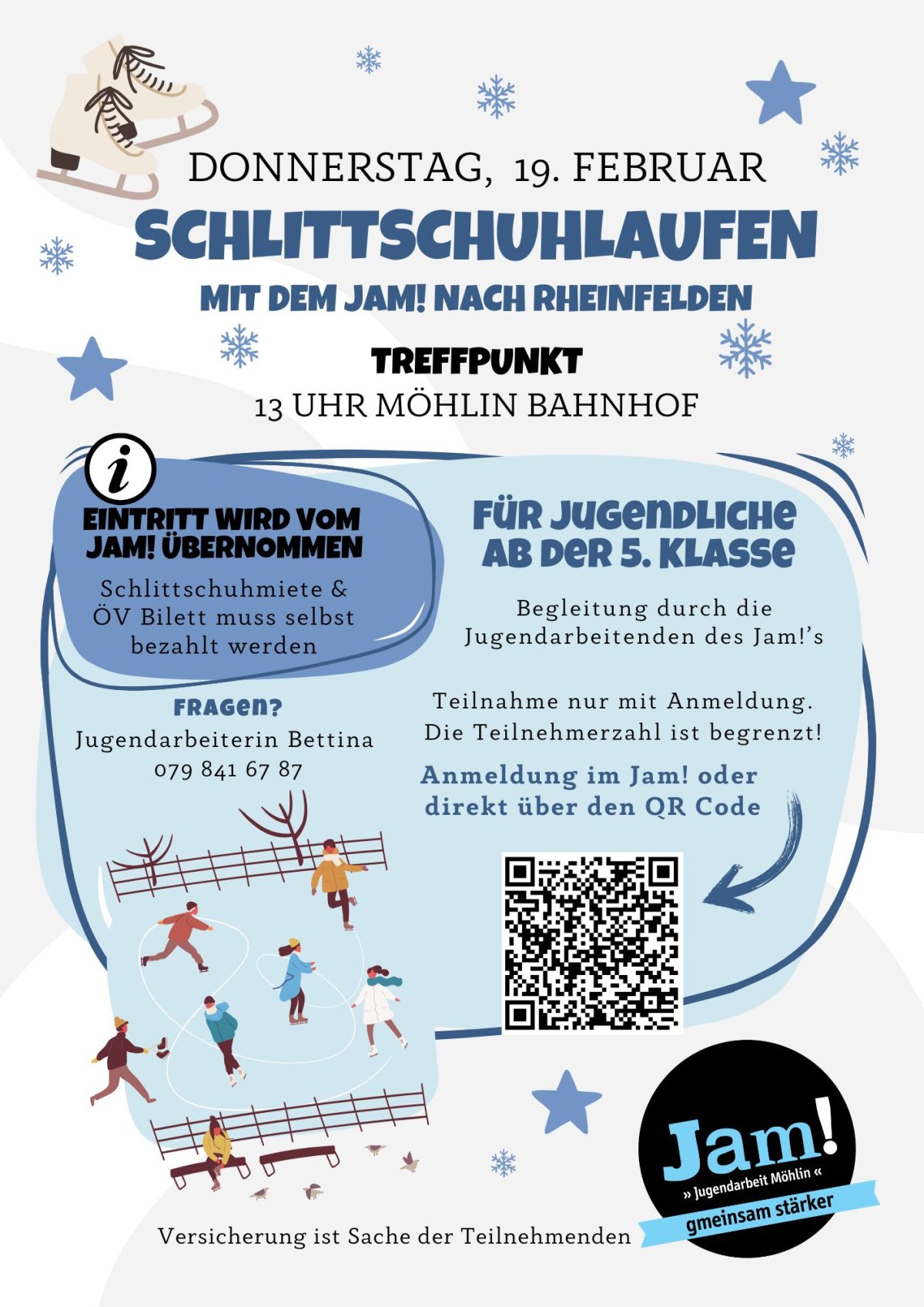 Komm mit uns am 19. Februar zum Schlittschuhlaufen nach Rheinfelden. Treff ist um 13 Uhr vor dem Kiosk am Bahnhof Möhlin. Um 17 Uhr schliesst die Eislaufbahn, dann fahren wir gemeinsam zurück und werden gegen 18 Uhr wieder in Möhlin sein.